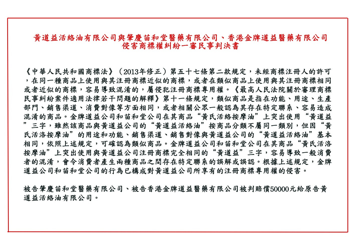 肇慶市中級人民法院民事判決書 有關 “肇慶苗和堂醫藥有限公司” 及 “香港金牌道益醫藥有限公司” 侵害商標權 案件編號(2015)肇中法民三初字第25号
