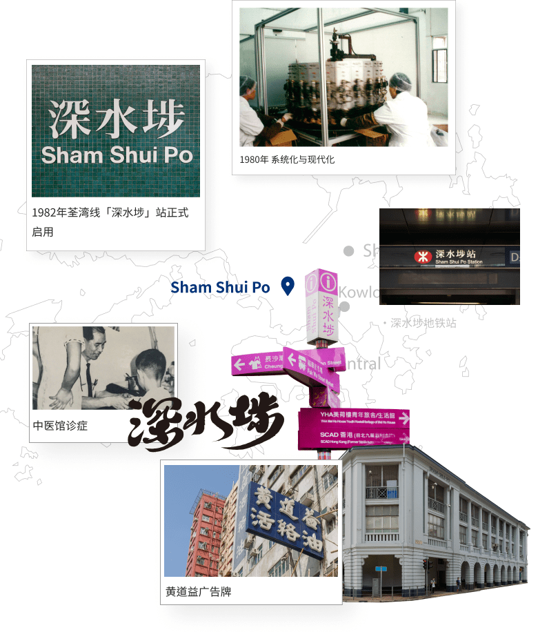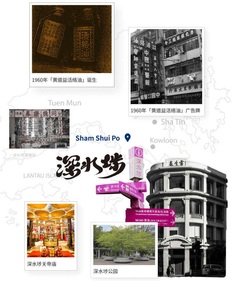 首间黄道益活络油零售店于深水埗开设,品牌凭药效与口碑建立在地信任,成为家传户晓的止痛良药。