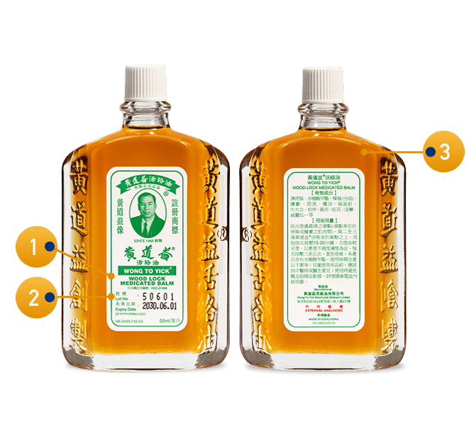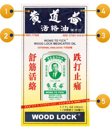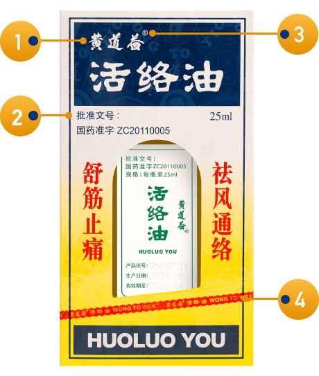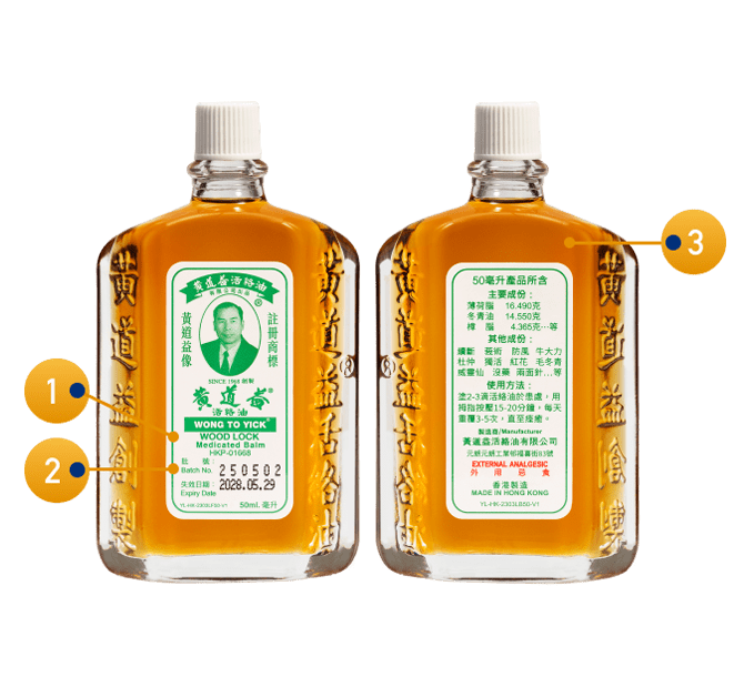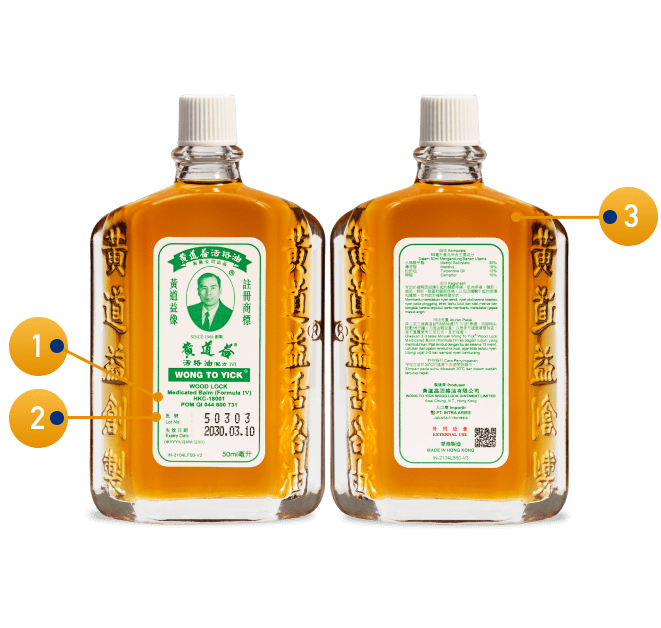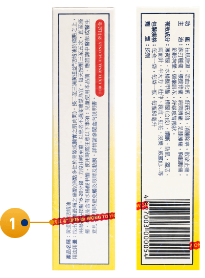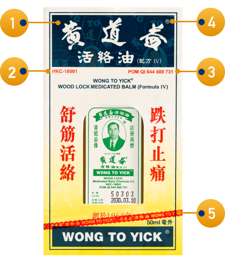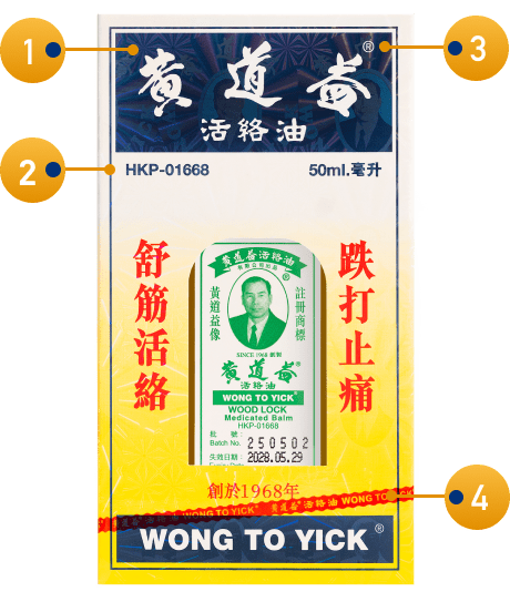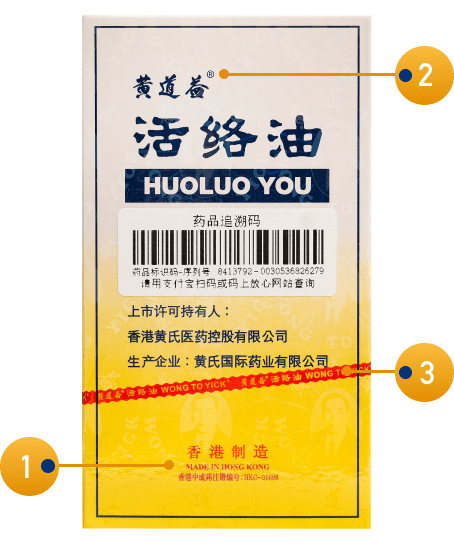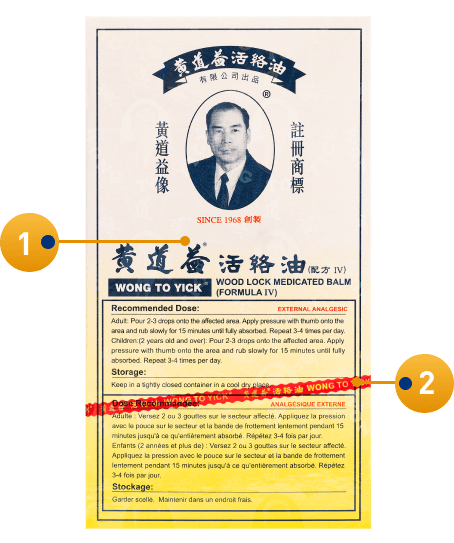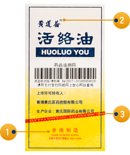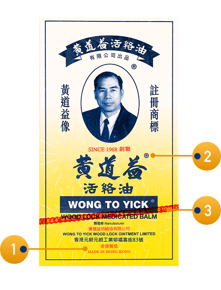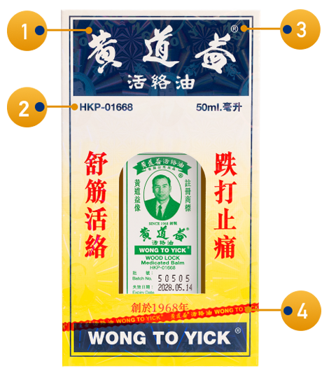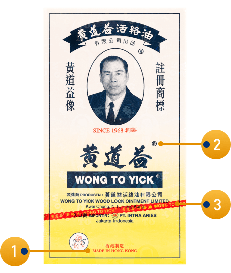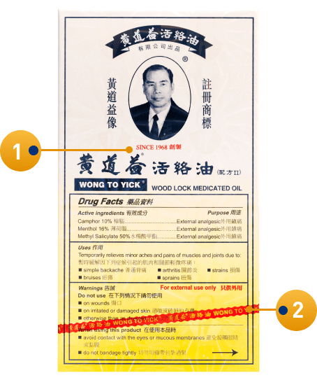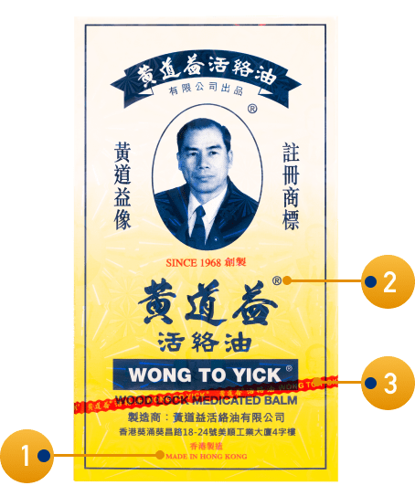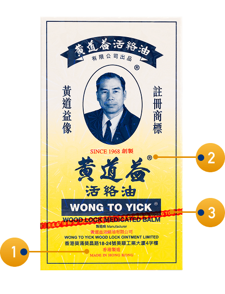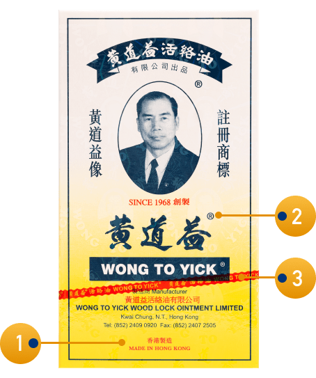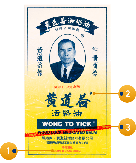 紅色波浪紋防偽斜撕條印有黃道益®活絡油及 WONG TO YICK® 字樣