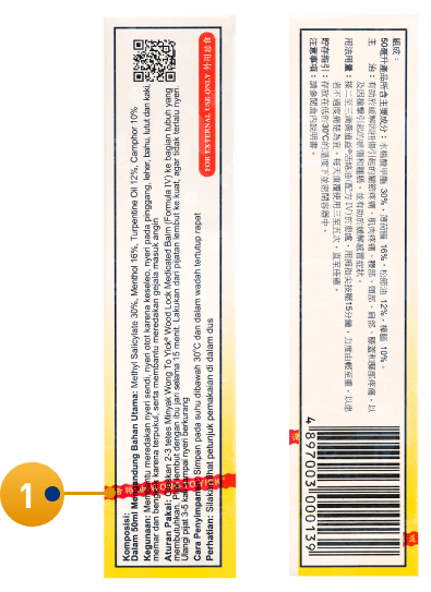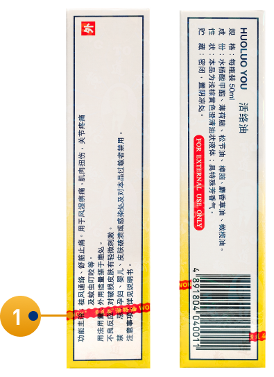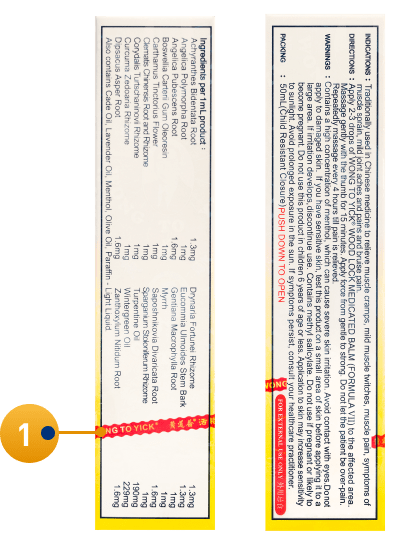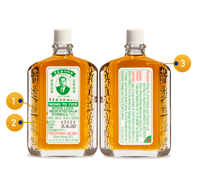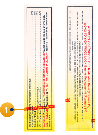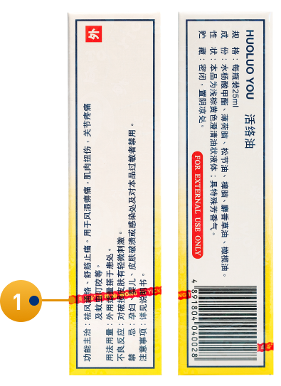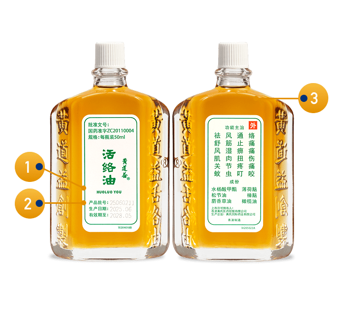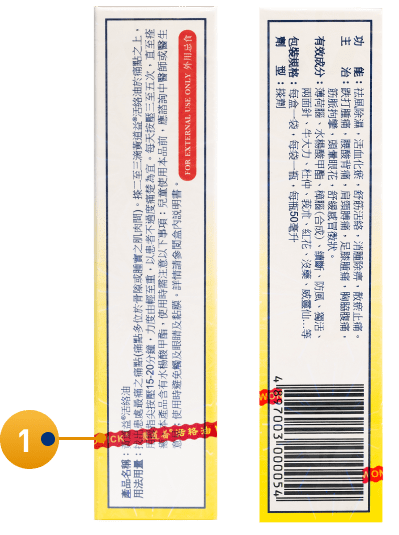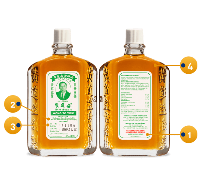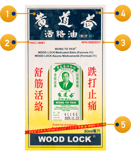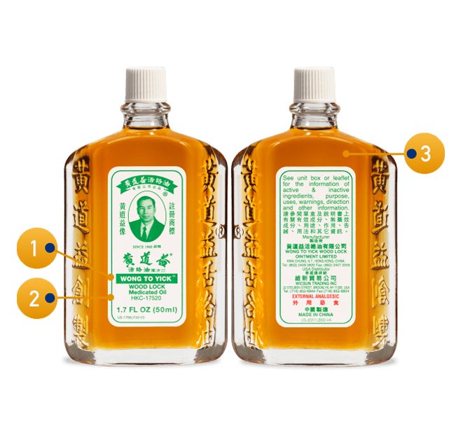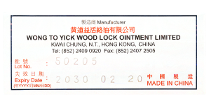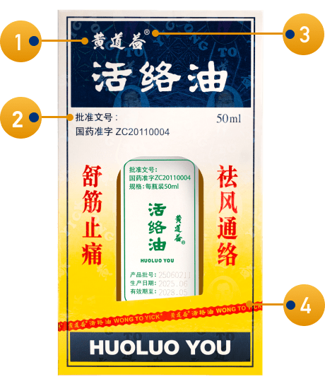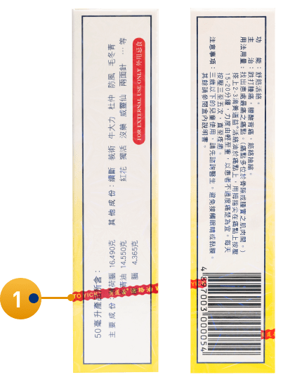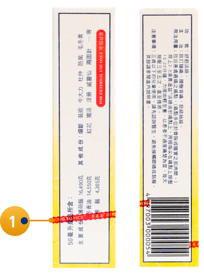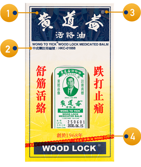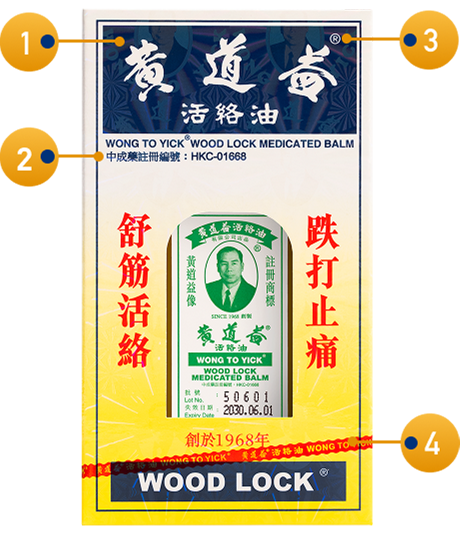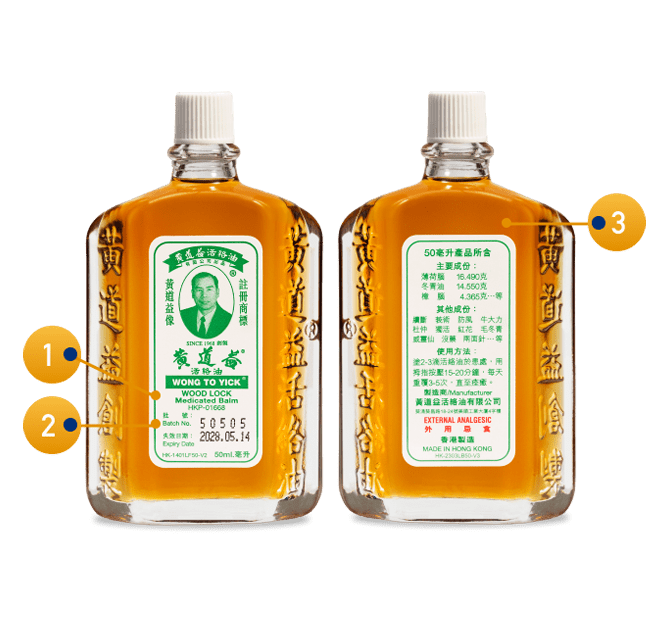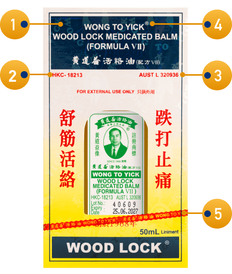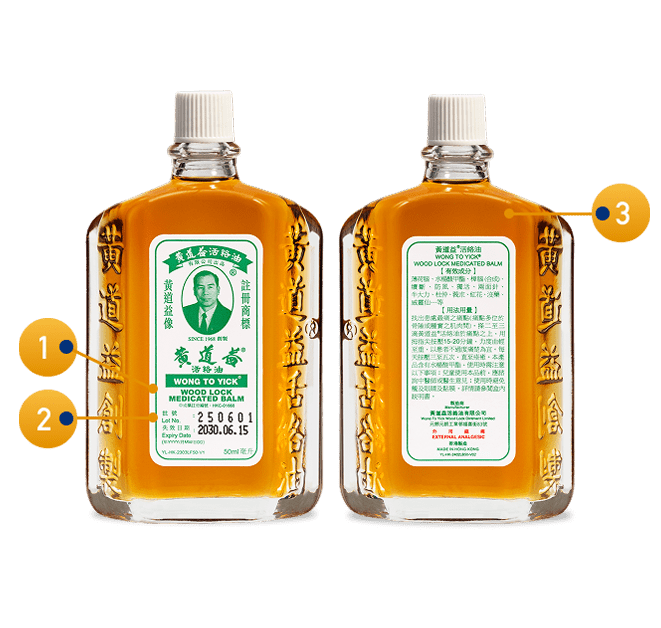 紅色波浪紋防偽斜撕條印有黃道益®活絡油及 WONG TO YICK® 字樣