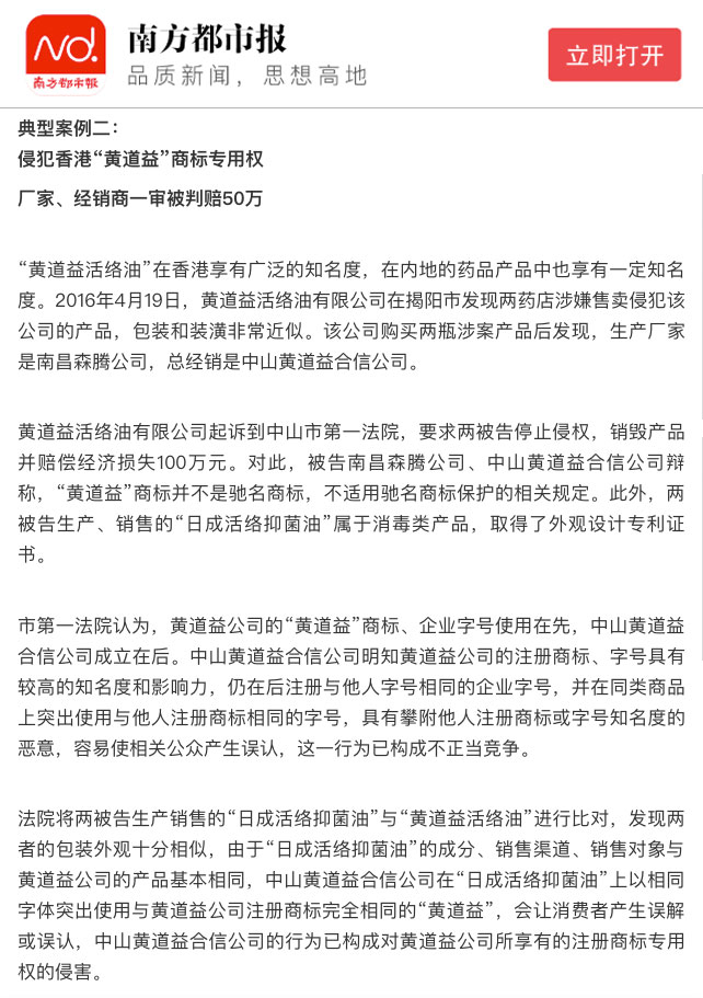 南方都市報 – 侵犯香港 “黃道益” 商標專用權 廠家、經銷商一審被判賠50萬