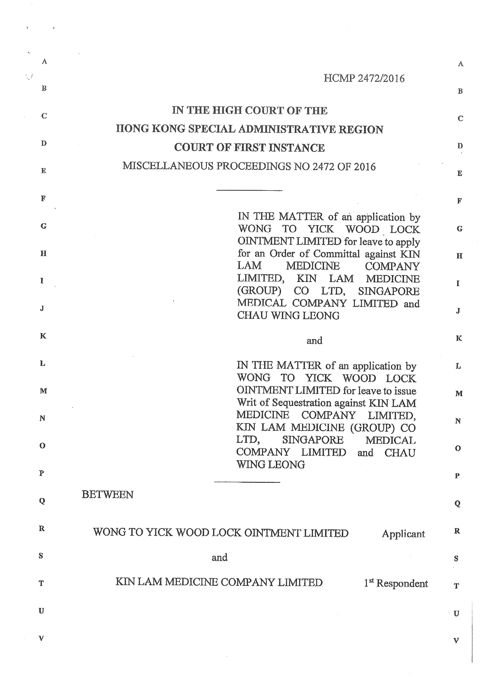 香港特別行政區高等法院一審法院 有關影射產品 “黃道活絡油” 判案書 案件編號HCMP 2472/2016
